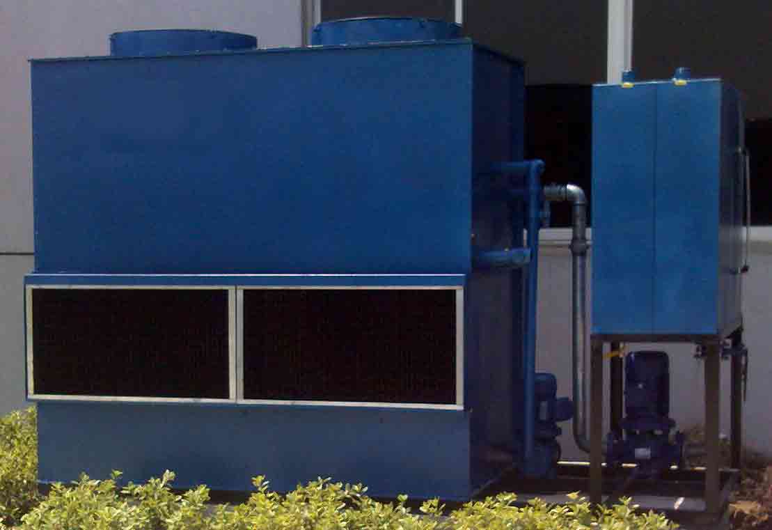 閉式冷卻塔利用水蒸發(fā)時(shí)吸收熱量的原理而使被冷卻液體冷卻。噴淋水(冷卻水)貯于冷卻塔底部,工作流體在閉式冷卻塔的散熱盤(pán)管內(nèi)進(jìn)行封閉循環(huán),噴淋水由噴淋系統(tǒng)泵經(jīng)水分配系統(tǒng)和噴淋嘴噴淋在盤(pán)管表面,一部分水被蒸發(fā),吸走熱量,從而降低管內(nèi)工作流體的溫度。熱空氣中的水和未蒸發(fā)的水被擋水板截住并流經(jīng)PVC熱交換層,PVC熱交換層中的水被流過(guò)的空氣冷卻,溫度降低,落入底下水盤(pán),由水泵再循環(huán)至水分配系統(tǒng),又回淋到盤(pán)管上,如此進(jìn)行循環(huán)冷卻。它是開(kāi)放式冷卻塔+板式換熱器+水泵+水池的有機(jī)結(jié)合,有很多獨(dú)特的優(yōu)點(diǎn)。
